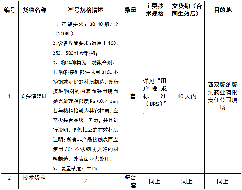 2021年西双版纳版纳药业有限责任公司6头灌装机设备采购项目招标公告